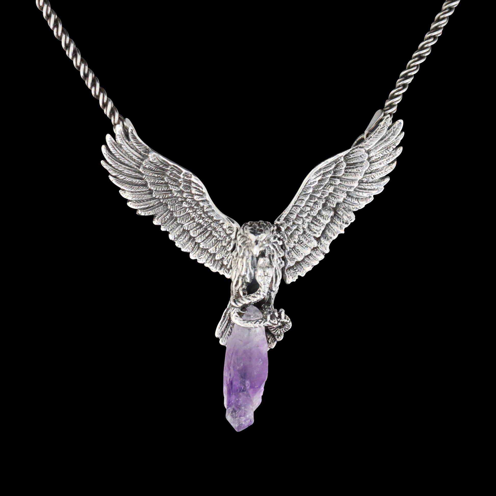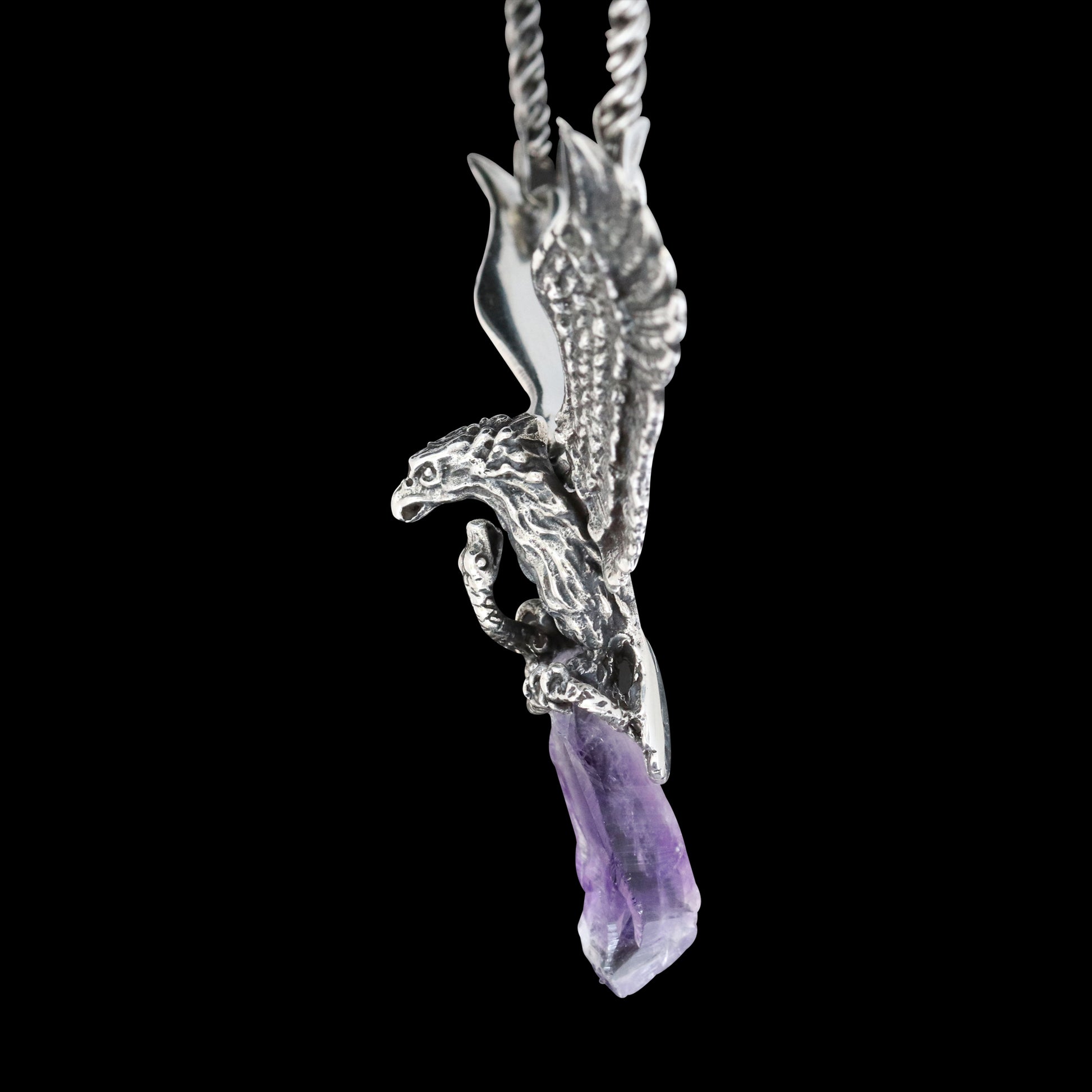 ♦ Vintage inspired 925 Sterling Silver Eagle + Serpent pendant with raw Amethyst point